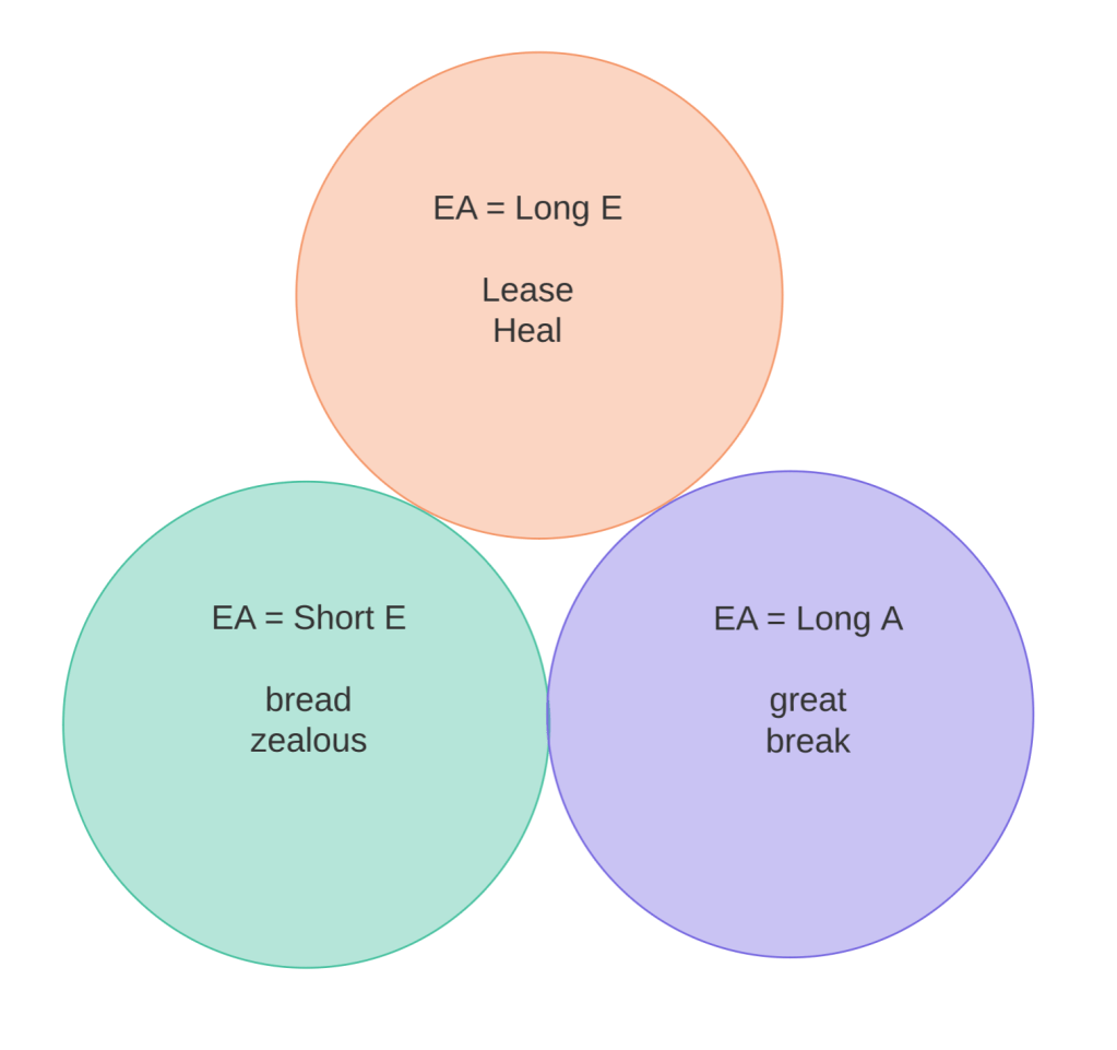 | The EA Spelling: This is a trick spelling! It has three sounds: Short E, Long E and Long A as in bread, meal and great respectively. If you see an EA spelling, and you are not sure of the word, you need to check the pronunciation. |